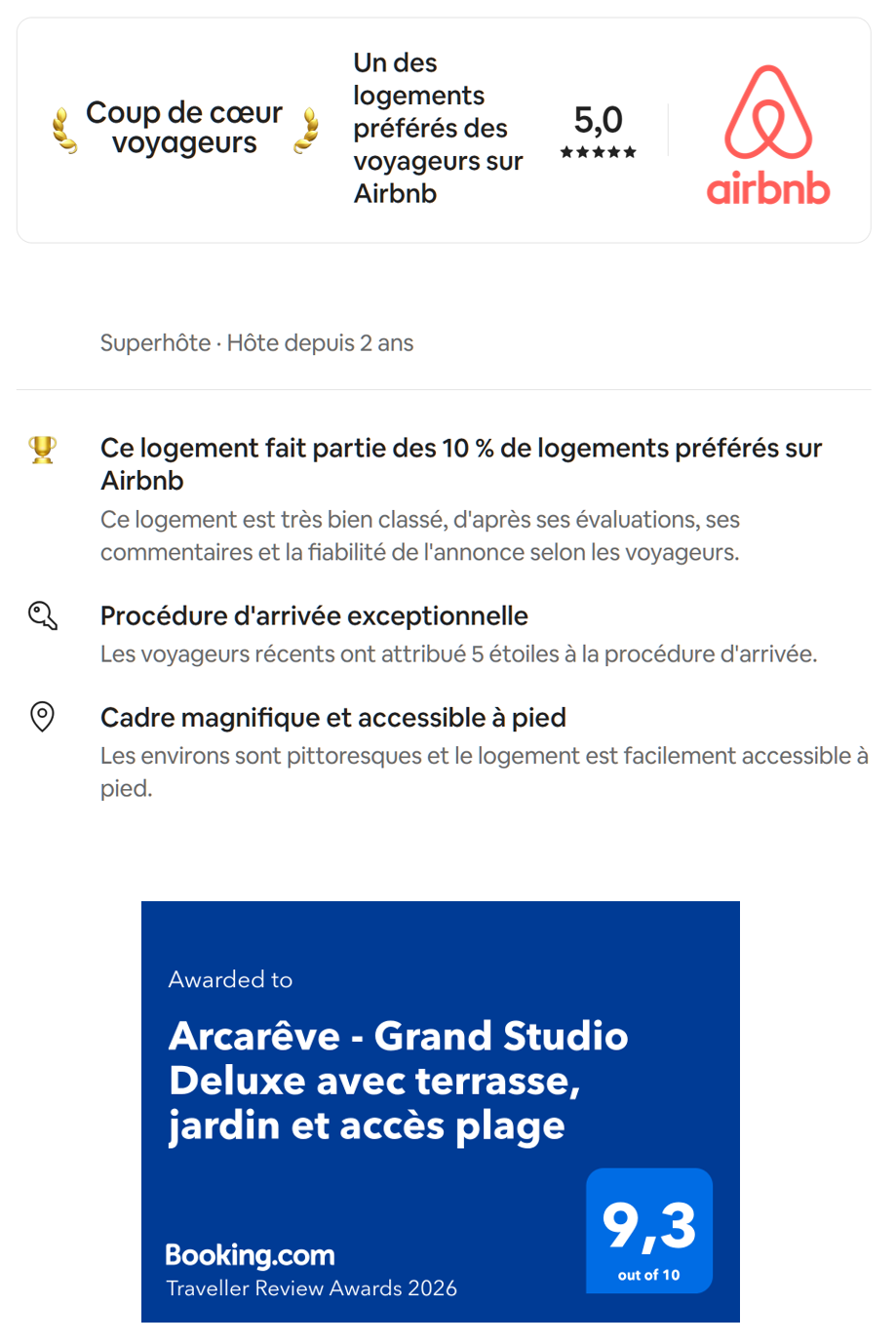 Dernièrement, ARCAREVE vient d'obtenir le Travel Award 2025 de booking.com garantissant la satisfaction des voyageurs qui lui ont attribué une note moyenne globale de 9,7 et une note de confort de 10/10 !